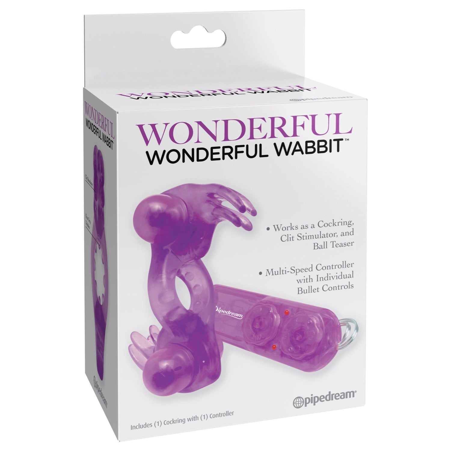 It?s a cock ring, clitoral stimulator, and ball teaser all-in-one! One bullet provides exciting clitoral stimulation as the wabbit?s ears flutter? the other pulsates against his testicles for a thrilling buzz. A snug squeeze from the stretchy cock ring ensures a stiff erection and prolonged action for both of you! You control the intensity of each bullet with the adjustable controls, so slide the wabbit on and dial in the fun. Remove the bullets from the cock ring and create your own fantasy. Either way, it's wonderful fun!